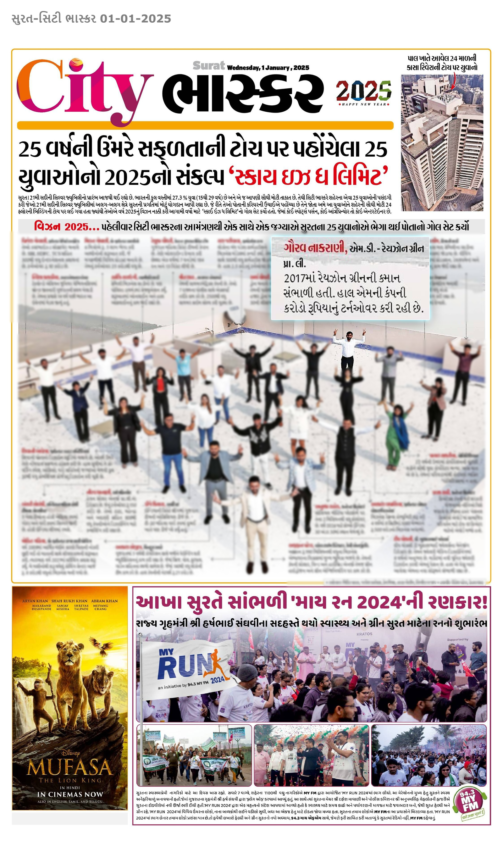 સુરત। 21મી સદીની સિલ્વર જ્યુબિલીનો પ્રારંભ આજથી થઈ રહ્યો છે. ભારતની કુલ વસ્તીમાં 27.3 % યુવા (15થી 29 વર્ષ) છે અને એ જ આપણી સૌથી મોટી તાકાત છે. તેથી સિટી ભાસ્કરે શહેરના એવા 25 યુવાઓની પસંદગી કરી જેઓ 21મી સદીની સિલ્વર જ્યુબિલીમાં અલગ-અલગ ક્ષેત્રે સુરતની પ્રગતિમાં મોટું યોગદાન આપી રહ્યા છે. જે રીતે તેઓ પોતાની કરિયરની ઉંચાઈએ પહોંચ્યા છે તેને જોતા અમે આ યુવાઓને શહેરની સૌથી મોટી 24 ફ્લોરની બિલ્ડિંગની ટોચ પર લઈ ગયા હતા જ્યાંથી તેઓએ વર્ષ 2025નું વિઝન નક્કી કરી આગામી વર્ષો માટે 'સ્કાઈ ઇઝ ધ લિમિટ'નો ગોલ સેટ કર્યો હતો. જેમાં કોઈ સ્પોર્ટ્સ પર્સન, કોઈ આંત્રપ્રિન્યોર તો કોઈ એન્ટરટેઈનર છે